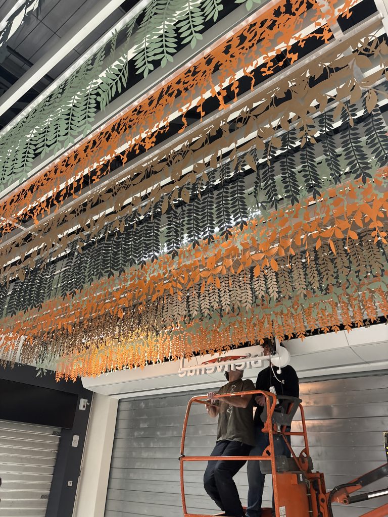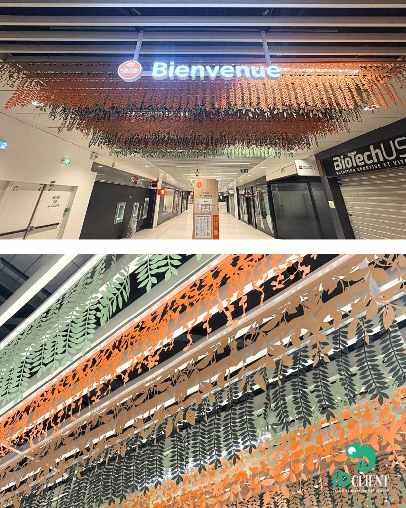 Pour le centre commercial @ccgrandplaisir, nous avons conçu et réalisé un concept « plafond feuillages » installé fin décembre au niveau de la passerelle.