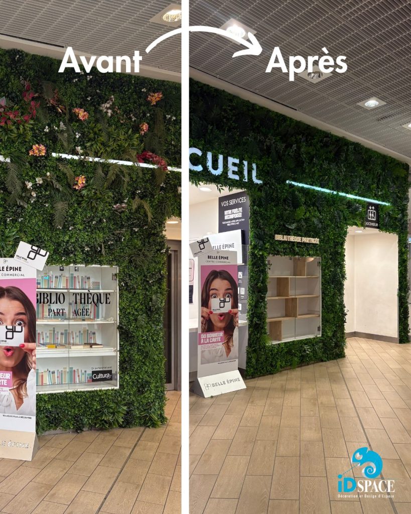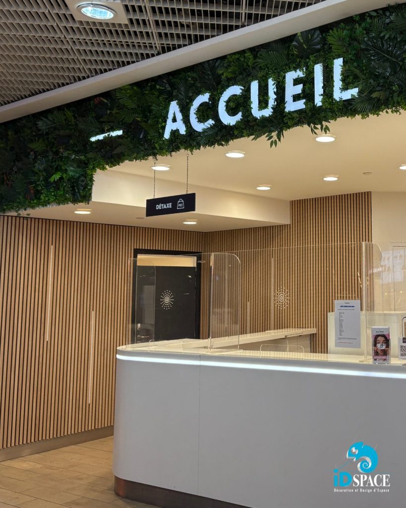 Pour l’accueil de Belle Épine, nous avons repensé le concept existant en jouant sur les matières, la lumière et le végétal afin de renforcer la signalétique et améliorer l’expérience des visiteurs