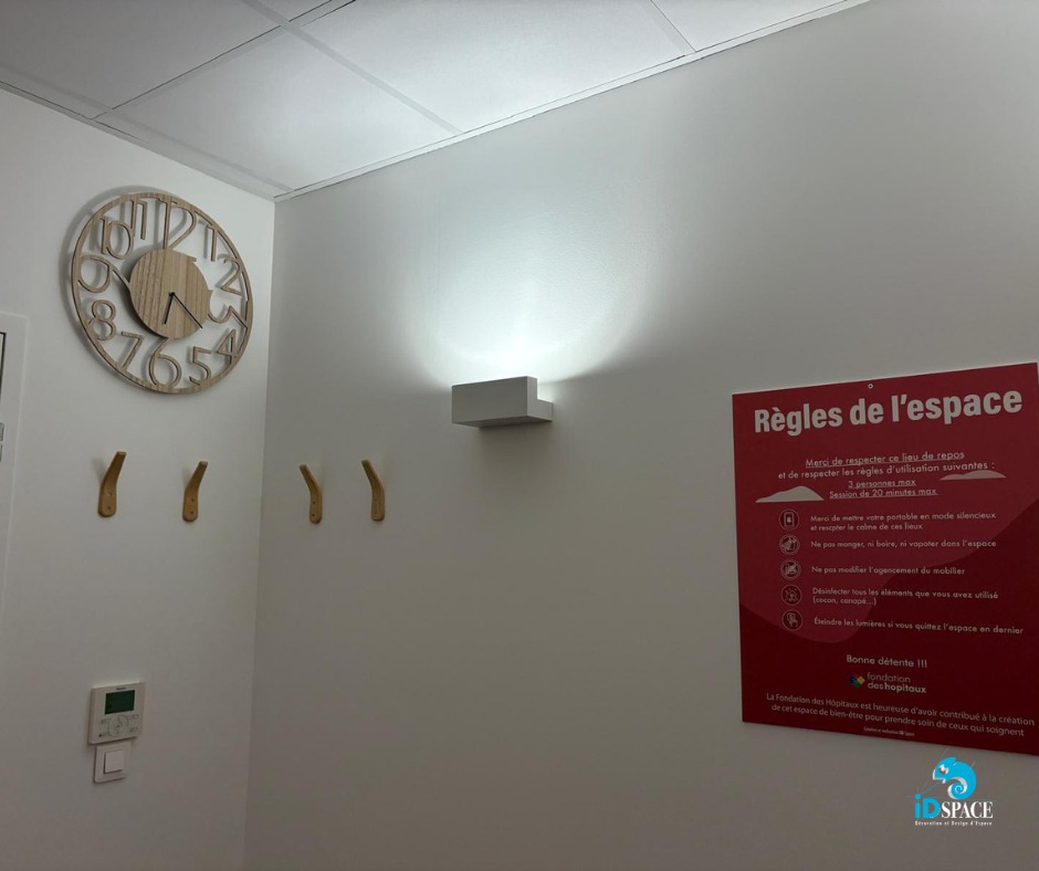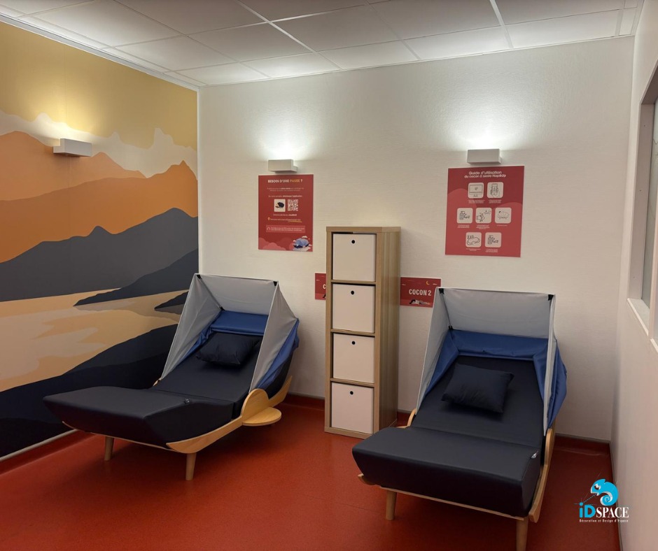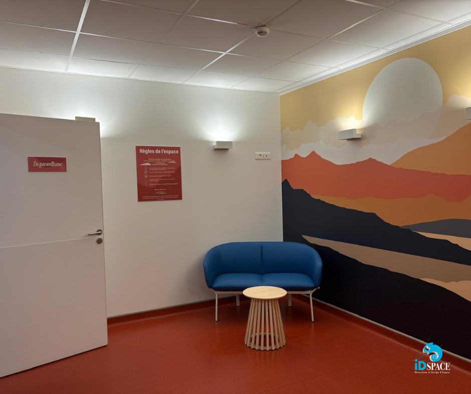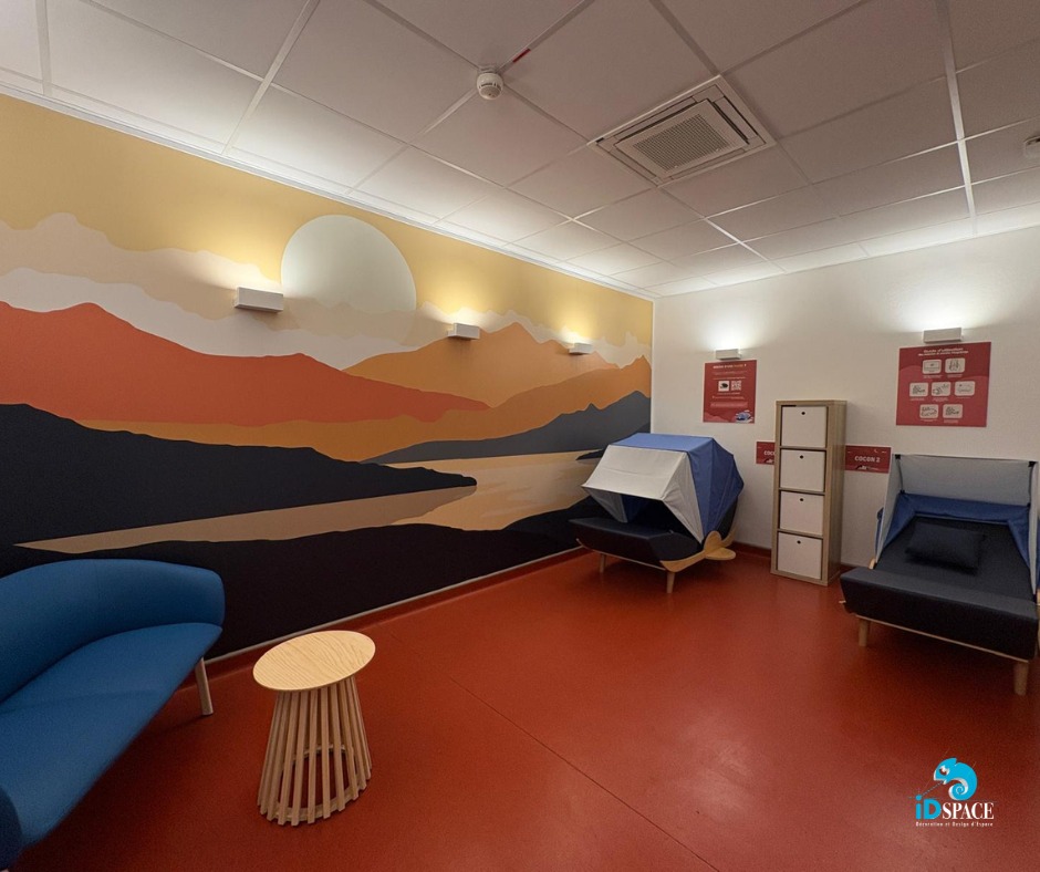 Objectif : repeindre, décorer et aménager un ancien espace d’attente avec décor mural adapté à la couleur du sol existant ; films dépolis imprimés, coin détente avec canapé et table basse, panneaux d’informations, horloge en bois et patères… et deux superbes cocons à sieste Nap&up qui permettront aux soignants de se ressourcer pendant leurs temps de pose limités.